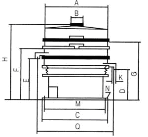 F:第三個出料口離地高度 G:第四個出料口離地高度 K:出料口直徑 M:底座內徑N:地腳孔數及孔徑 Q:出料口間距